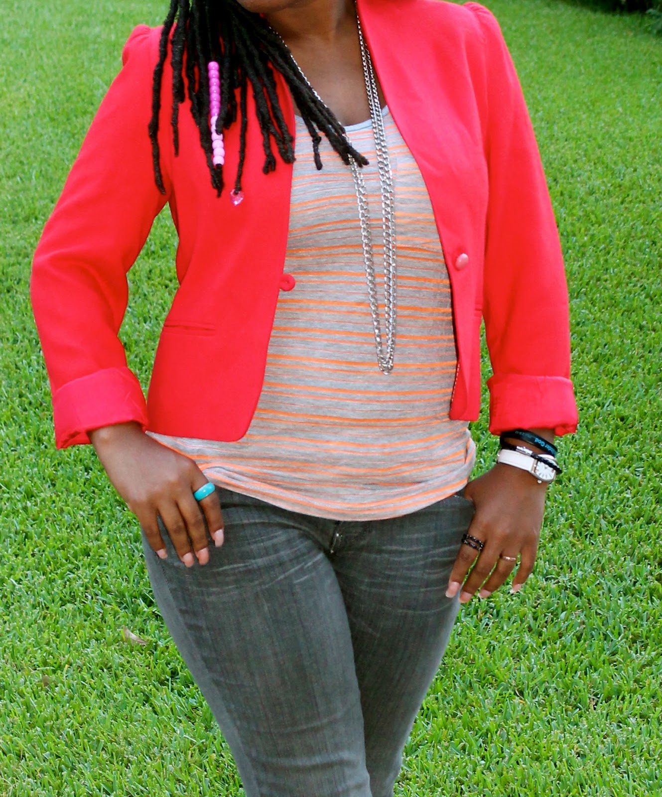 I am in desperate need of a nice pair of boyfriend jeans but, till I find one that works for petite frame, these grey-jeans will do.. P.s I haven't wear them in over a year... Btw, my blazer is red and the shoes are orange, they kind of looks red on film. Anyways, checkout the look and let me know what you think, muahhhh